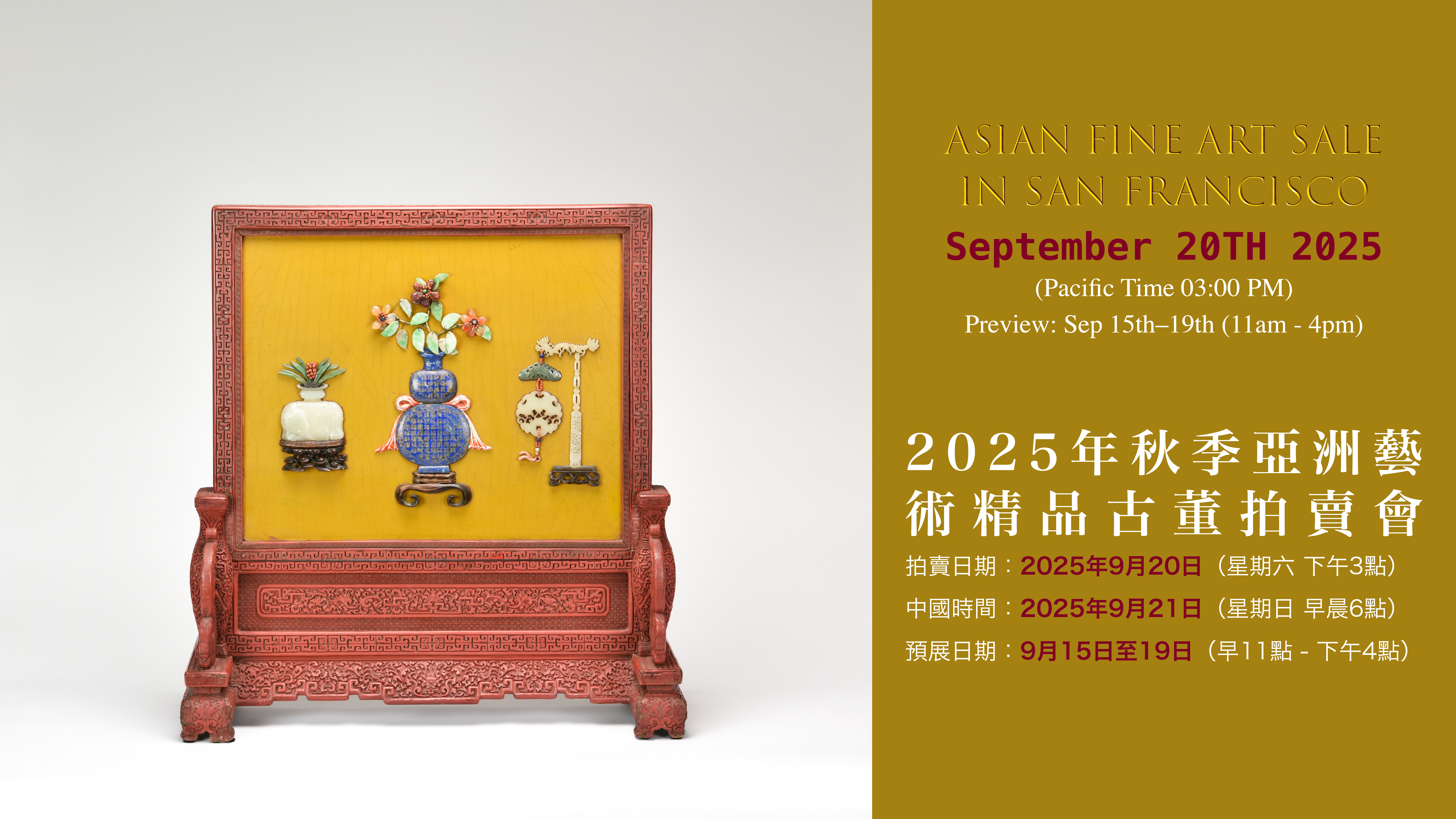 This Autumn, Golden State Auction presentsImperial masterpieces including a Qianlong cinnabar screen with imperial inscription and a cloisonné plaque from the Ning Shou Palace;